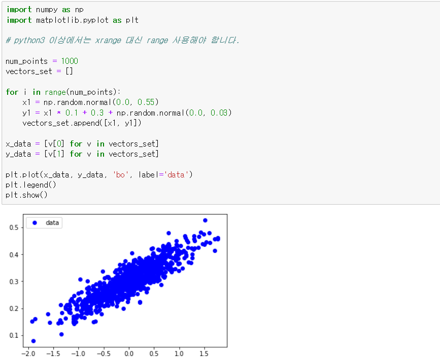 데이터를 생성하기 위해 정규화로 분포된 좌표 값을 생성하기 위해 numpy를 임포트합니다. 이 코드는 y = 0.1*x + 0.3 관계를 가지는 데이터를 생성하는데 random.normal() 함수를 사용하여 정규분포(normal distribution)로 변화를 주어 데이터를 분산되도록 하여 실제 데이터 유사하게 만듭니다. 이 함수식을 1000번 반복해서 1000개의 데이터를 만들어 list에 저장합니다.