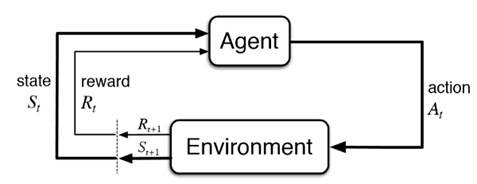 강화학습의 전체 flow는 다음과 같습니다. 에이전트(행위자-agent)의 액션(행위-action)은 환경(world, environment)에 영향을 줍니다. 특정 액션은 환경의 상태(state)를 변화시키고 이에 따라 에이전트는 보상(reward)을 받게 됩니다. 이를 그림으로 표현하면 아래와 같습니다.