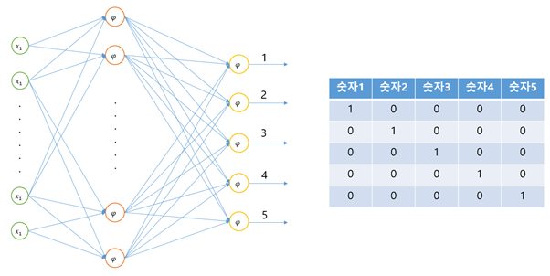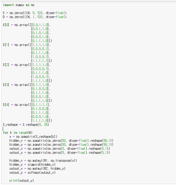 변수 X를 보면 흰색 픽셀은 0으로, 검정색 픽셀은 1로 바꿔서 이미지를 2차원 행렬로 변환시켰습니다. 변수 D에는 신경망이 출력해야 하는 정답이 행 단위로 들어 있습니다. 변수 D의 값을 살펴보면 5개 출력 노드에 관해 one-hot 인코딩 방식으로 정답을 구성했다는 사실을 알 수 있습니다.