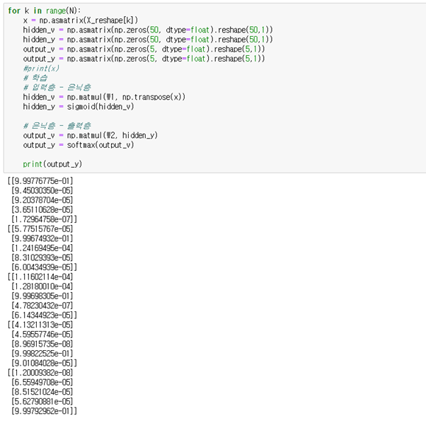softmax를 사용하면서 출력층의 노드가 여러 개가 되었습니다. 즉 정답의 차원이 1차원이 아니라 분류되는 범주의 차원으로 변경됩니다. 따라서 오차-출력층에서 d 행렬타입을 1행 5열에서 5행 1열로 꼭 변경해야 합니다.