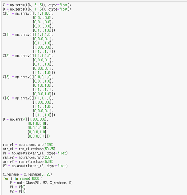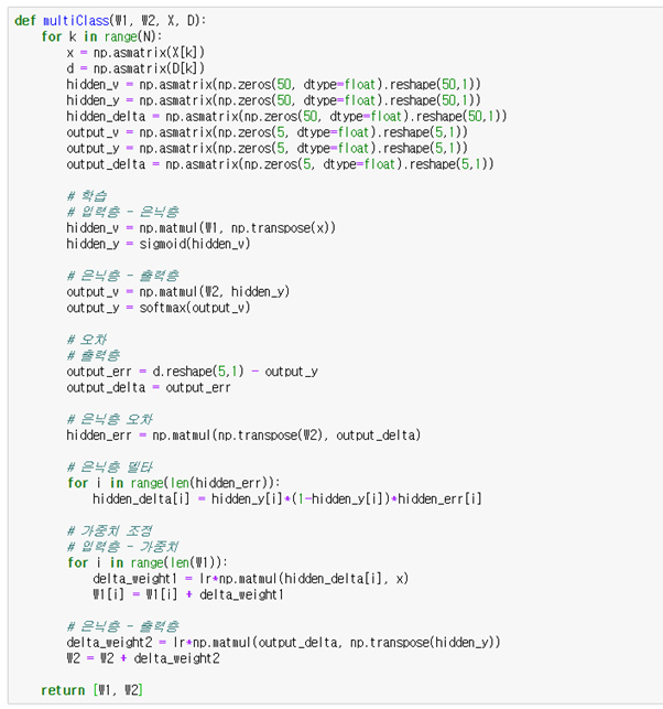 multiClass 함수의 파라메터 W1은 입력층-은닉층의 가중치 행렬, W2는 은니층-출력층의 가중치 행렬을 나타내는 변수입니다. X는 학습 데이터의 입력 데이터, D는 학습 데이터의 정답을 담고 있는 변수입니다. multiClass는 학습 데이터를 하나 꺼내 델타 규칙에 따라 가중치 갱신값(dw1, dw2)을 계산하고, 이 값으로 신경망의 가중치를 새로 갱신합니다.