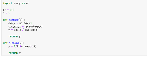 softmax() 함수와 sigmoid() 함수의 지수함수 구현을 위해 numpy를 import 합니다. numpy는 아래 구현에서 리스트 및 행렬 연산에서도 사용됩니다.