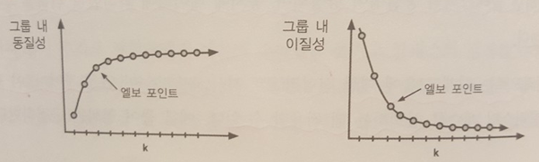 다른 방법으로 엘보법(elbow method)이 있습니다. 이 기법은 다양한 K값에 대해 클러스터 내의 동질성(homogeneity)과 이질성(heterogeneity)이 어떻게 변하는지를 측정합니다.