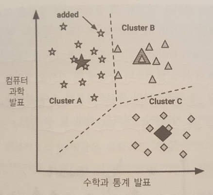 점선은 클러스터 중심에 의 생성된 브로노이 다이어그램(Voronoi diagram)의 경계를 나타냅니다. 브로노이 다이어그램은 다른 것보다 특정 클러스터 중심에 더 가까운 영역을 나타냅니다. 또한 세 경계가 만나는 점은 세 클러스터의 중심으로부터 최대 거리입니다. 이 경계를 이용해 초기 K-평균 시드(seed)가 차지하는 영역을 알 수 있습니다.