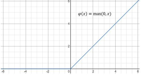 다음 그림은 ReLU 함수의 그래프입니다. 입력이 음수이면 0을 출력하고, 양수이면 입력값 그대로 출력하는 함수입니다.