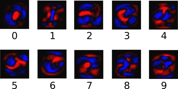 아래 그림은 MNIST 데이터 셋을 통해 학습한 10개의 레이블/클래스입니다. 붉은색은 음의 가중치를 나타내고 푸른색은 양의 가중치를 나타냅니다.