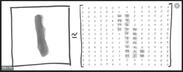 이미지의 첫 번째 차원은 각 이미지에 대한 인덱스이며 두 번째 차원은 이미지 안의 픽셀 수를 나타냅니다. 이 이미지는 28*28 픽셀로 구성되어 있으므로 수치 행렬로 나타낼 수도 있습니다. 예를 들면 숫자 1의 한 이미지는 다음과 같이 행렬로 나타낼 수 있습니다.