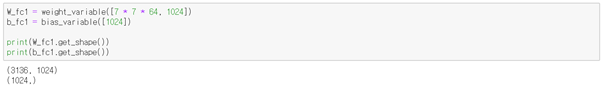 소프트맥스 함수를 적용을 위해 출력 값 h_pool2에 Fully Connected를 연산합니다. 1024개의 노드를 사용하겠습니다. 즉 가중치는 [이미지 사이즈 * 필터 수, 노드 수] 이고 편향은 [노드 수] 개 입니다.