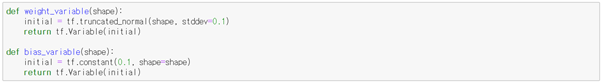 행렬 W와 편향 b와 정의하는 함수를 구현합니다. 가중치는 표준편차를 0.1로 갖는 난수로 초기화하여 Varialbe 타입으로 리턴합니다. 편향은 작은 양수(0.1)로 초기화하고 Varialbe 타입으로 리턴합니다.