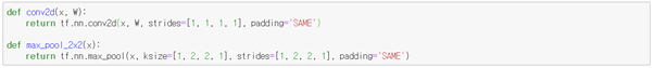 2D 컨볼루션과 맥스풀링을 정의하는 함수를 구현합니다. 텐서플로에서는 컨볼루션 관련 함수를 제공합니다. 함수명 끝 2d는 차원을 뜻합니다. stride는 1로 하고 패딩은 0으로 하는 컨볼루션 레이어를 만드는 함수를 정의합니다.