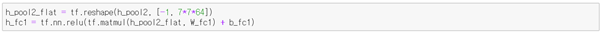 소프트맥스 함수는 이미지를 직렬화해서(1차원으로 변환) 벡터 형태로 입력해야 합니다. tf.reshape()함수를 사용해서 h_pool2을 직렬화 시킵니다. 그리고 W_fc1와 Fully Connected를 수행하고 편향을 더하고 ReLU 활성화 함수로 적용합니다.