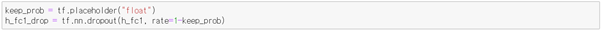 다음 단계는 드롭아웃(dropout)이라는 기법을 통해 신경망에서 필요한 매개변수 수를 줄이는 것입니다. 텐서플로에서 제공하는 tf.nn.dropout 함수를 사용하여 드롭아웃을 적용합니다(드롭아웃 자세한 내용은 https://ynebula.tistory.com/36 참고바랍니다). rate는 비활성되는(discard) 노드의 수를 설정하는 파라메터로 플래이스홀더 변수를 이용해 다음과 같이 구현합니다.