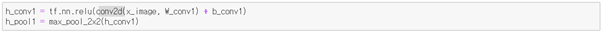 첫 번째 컨볼루션 레이어를 만들기 위해 학습 데이터(x_image)에 대해 합성곱을 적용하고 편향을 더해줍니다(목표함수 수행). 그리고 활성화 함수로 ReLU(Rectified Linear Unit)를 적용합니다. 다음으로 출력 값을 구하기 위해 맥스 풀링을 적용합니다. 그리고 2x2 맥스 풀링 레이어를 위한 함수를 정의합니다.