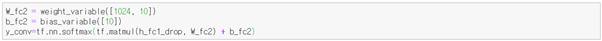 마지막으로 소프트맥스 레이어를 추가합니다. Fully Connected 연산을 수행을 위해 가중치와 편향을 정의해야 합니다. 가중치는 이전 계층 수 1024와 정답 수 10로 이루어지며 편향은 정답 수 10으로 정의합니다. Fully Connected를 수행하고 Softmax 활성화 함수를 적용합니다.