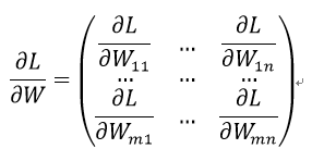 이처럼 벡터의 각 원소에 대한 미분을 정리한 것이 기울기(gradient)입니다. 벡터와 마찬가지로 행렬에서도 기울기를 적용할 수 있습니다. W가 m*n 행렬이면, L=g(W) 함수의 기울기는 다음과 같습니다(L의 W에 대한 기울기).