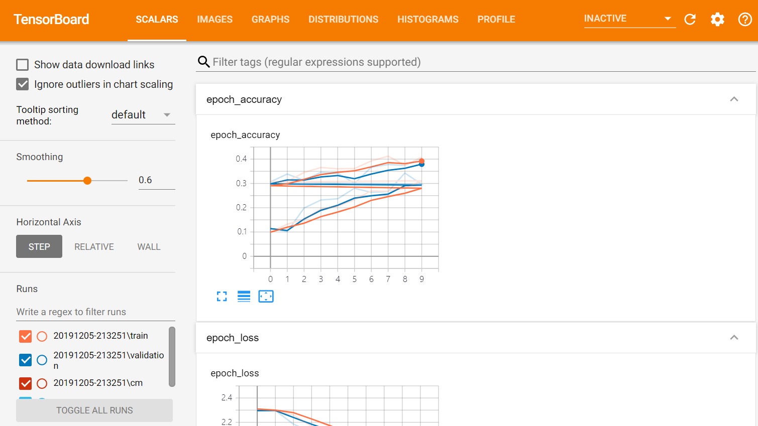 | (tensoflow2.0) C:\workspace\logs>tensorboard --logdir=./ W1205 22:15:48.631925 11308 plugin_event_accumulator.py:294] Found more than one graph event per run, or there was a metagraph containing a graph_def, as well as one or more graph events. Overwriting the graph with the newest event. Serving TensorBoard on localhost; to expose to the network, use a proxy or pass --bind_all TensorBoard 2.1.0a20191205 at http://localhost:6006/ (Press CTRL+C to quit) |