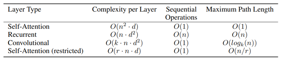As noted in Table 1, 하나의 self-attention layer는 연속적으로 수행되는 operations 수의 모든 positions 연결한다. 반면, recurrent layer는 O(n) sequential operations이 필요하다. 즉, representation dimensionality d보다 작은 sequential length n일 때, 복잡한 연산에서 self-attention layers이 recurrent layers보다 빠르다.