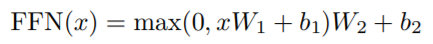 추가로 각 position을 구분하기 위해 attention sub-layers, encoder and decoder의 각 layer는 fully connected feed-forward network로 구성되어 있다. 이것은 두 개의 linear transformations와 ReLU activation으로 구성되어 있다. 다른 position에서는 같은 linear transformations을 사용하지만, 다른 parameters를 사용한다.