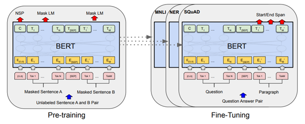 우리는 BERT와 자세한 구현법을 이 Section에서 소개합니다. 두 개의 절차가 있습니다(pre-training과 fine-tuning). Pre-training동안, 여러 pre-training 과제에서 unlabeled data로 학습합니다. Fine-tuning동안, BERT 모델은 먼저 사전 훈련 된 매개 변수로 초기화되며, 모든 매개 변수는 다운 스트림 작업에서 레이블이 지정된 데이터를 사용하여 미세 조정됩니다. 같은 pre-trained parameter로 초기화 될 지라도, 각 downstream 과제는 fine-tune된 model로 분리됩니다. Figure 1에서 예 question-anwsering은 이번 Section 예제로 사용될 예정입니다.