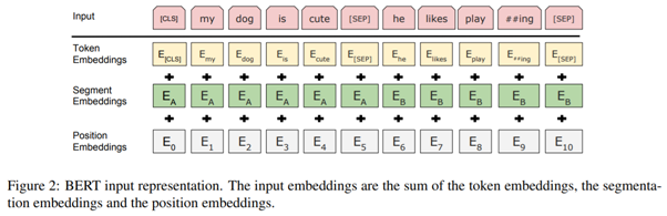 주어진 token으로, input representation은 대응하는 token, segment, position embeddings의 합으로 생성됩니다. 이 생성 방법은 Figure 2에서 볼 수 있습니다.