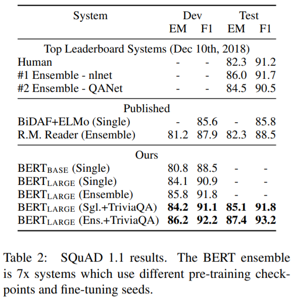 Table 2에서 top published systems(Seo et al., 2017; Clark and Gardner. 2018; Peters et al., 2018a; Hu et al., 2018) 와 top leaderboard entiris를 확인할 수 있습니다. SQuAD leaderboard의 top 결과는 최신 public system descriptions를 갖지 못 했습니다. 그래서 우리는 SQuAD를 fine-tuing하기 전에,TriviaQA로 처음 fine-tuning하여 약간의 data argumentation으로 사용했습니다.