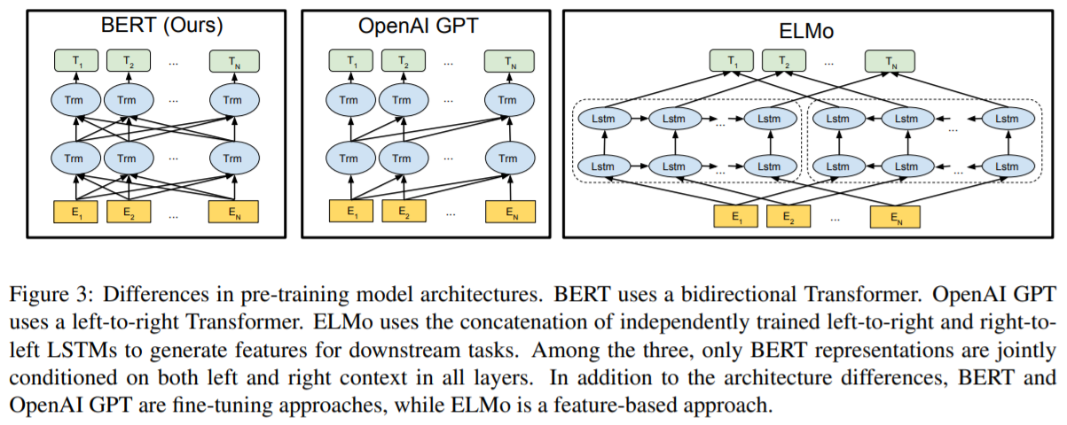 최근 인기있는 representation learning models를 연구합니다(ELMo, OpenAI GPT, BERT). Figure 3에서 model architecture간 비교를 보여줍니다. BERT와 OpenAI GPT는 fine-tuning 방식입니다. 반면 ELMo는 feature-based 방식입니다. BERT와 가장 유사한 기존 pre-training 방법은 OpenAI GPT입니다. OpenAI GPT는 large text corpus에서 left-to-right Transformer LM으로 훈련합니다. ERT의 많은 설계는 두 방법이 비교할 수 있게 GPT와 유사하게 만들어 졌습니다.